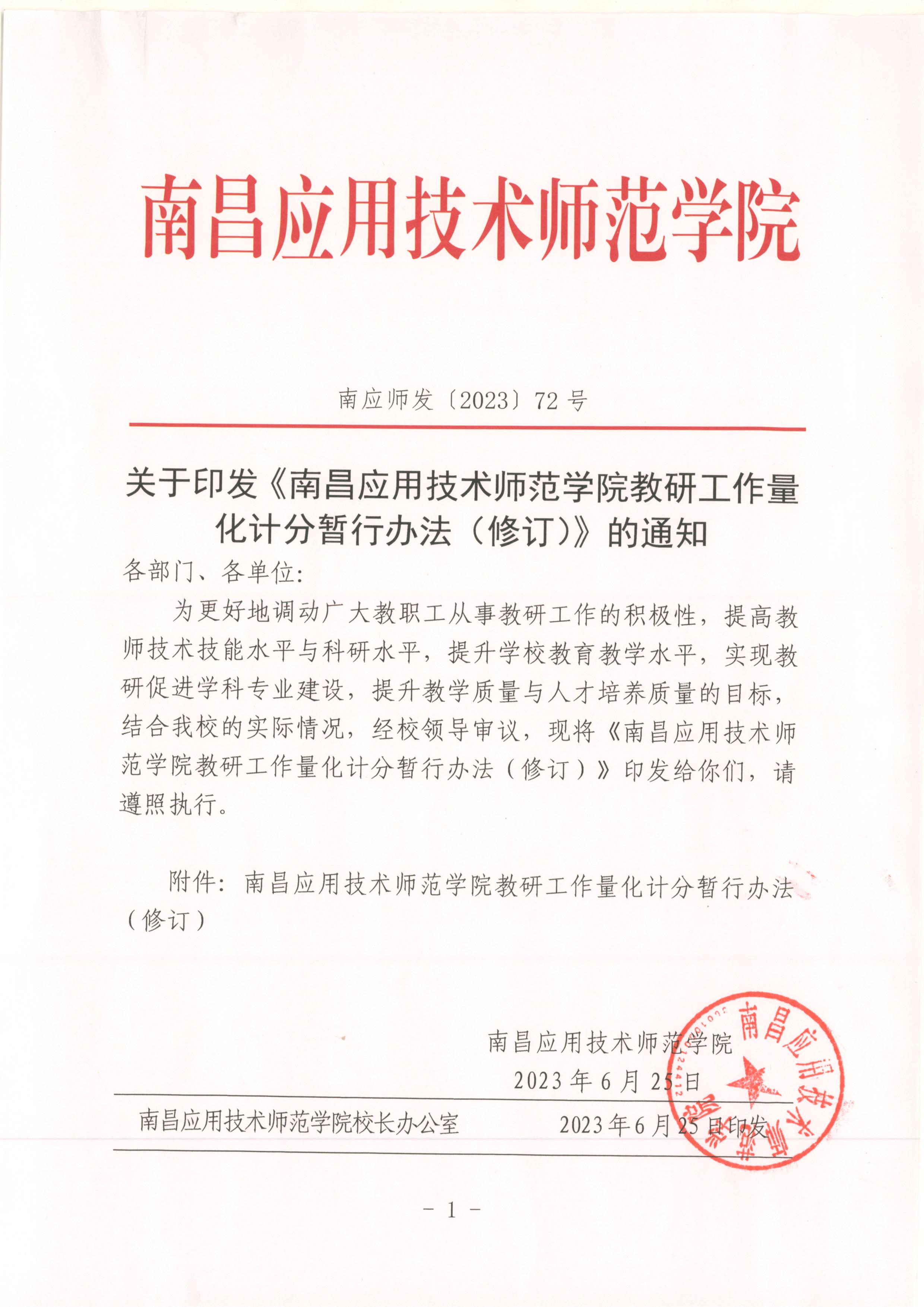 首页栏目 学生工作 综合新闻 通知公告 您现在的位置是:首页 > 首页栏目 > 通知公告 关于印发《南昌应用技术师范学院教研工作量化计分暂行办法(修订)》的通知 管理员2023-06-263000 附件:南昌应用技术师范学院教研工作量化计分暂行办法(修订) 上一篇 关于转发《关于做好论文学术不端自查和挂名现象清理工作的通知》的通知 下一篇 关于2025年校级智慧课程拟立项名单的公示