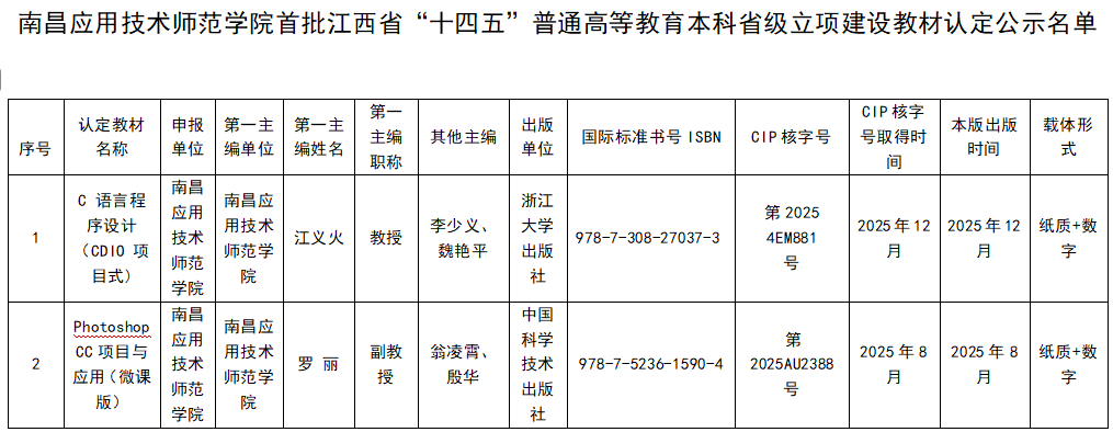 根据《江西省教育厅关于开展首批江西省“十四五” 普通高等教育本科省级立项建设教材认定工作的通知》(赣教高字〔2025〕32号)要求,结合我校教材建设实际,现将我校首批江西省 “十四五” 普通高等教育本科省级立项建设教材认定材料报送相关事项公示如下: