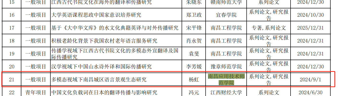 近日,江西省社会科学规划办公室公布了2022年江西省社会科学基金立项项目,我校杨虹老师主持的《多模态视域下南昌城区语言景观生态研究》喜获立项,是我校首次获得江西省社科基金项目立项。